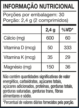 A combinação entre cálcio elementar, magnésio, vitamina K2 (menaquinona-7) e vitamina D3 reúne nutrientes que participam de funções importantes do organismo.