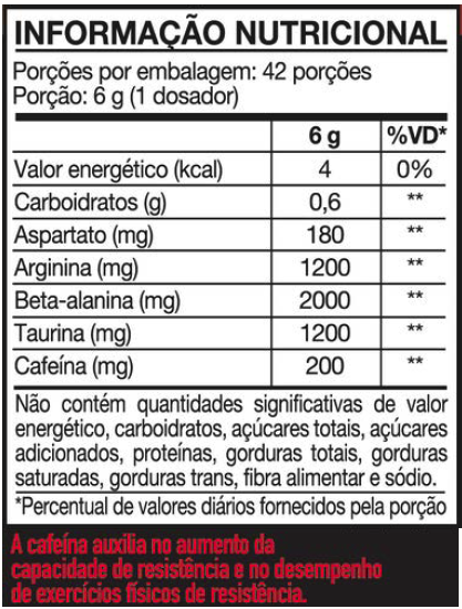 Beta-alanina, taurina, L-arginina, dextrose, cafeína, ácido L-aspártico, gengibre em pó, aromatizante, antiumectantes dióxido de silício e bicarbonato de sódio, acidulante ácido cítrico, edulcorante sucralose e corante verde folha.
